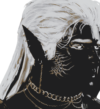 Conceived in 1361 DR, Bhinfein was the name bestowed upon him by his House. The House in question, was known as the Yril'Lys within Menzoberranzan, a low - ranking family as opposed to the more prestigiously known & powerful estates in comparison. Since his infancy, he was raised under a Priestess & subjected to become an elite warrior serving under Lolth, taught fealty & obedience, & if he ever questioned her motives or wisdom, it was considered a sin. The Yril'Lys House was destroyed after the Siege of Menzoberranzan — specifically the first Slave Revolt, which took place in 1372 DR. Venore, originally named Bhinfein, was eleven years old during this siege. Because of Yril'Lys weakened power & barely had the ability to fend off endangerment to the uprise, it met its fate.Houses typically kept slaves, & The Yril'Lys had its own fair few of them. Bhinfein was subjected two slaves of his own to accompany his needs. However, he befriended one who had originally came from the surface. Her name was Rashemi, & she used the chaos of the revolt to urge him away from the clutches of the Lolth, and follow under the guidance of the Church of Eilistraee. Bhinfein, young & who no longer had a House to serve, ultimately ended his devotion & to find purpose beyond the Underdark.He was renamed Venore, & his escape from the Underdark was a matter of survival than actual desire ( house fell, low-born who earned the ire of a noble, no longer had purpose, fealty to Lolth would govern him to death ), & he didn't learn about the society he was raised into became the hellscape that it was until he experienced the difference through the shared experiences of Rashemi, who lent her stories & childhood. This would also lengthen when he’s reached the surface thanks to the Church.Because Venore’s origination & pitted strength against weaker drow of his own kind ; his own brother ; in a yearning hunger for strength, it aided him when he was on the verge towards his adulthood. He had managed to embody his rage to empower his hard hitting attacks, excelling when he notices something going awry within his surroundings. He had learnt that the surface of Faerûn had opportunities ; adventure ; sights to see.He subjected himself living in seclusion for a while, in an attempt of adapting to this foreign world, the light, & redemption. Far from the reaches of the Underdark, Venore gradually settled in an a society more accepting of his kind, the Dragon Coast. A lawlessness place with bustling trade routes, & the presence of powerful city-states, thieves' guilds, and pirate bands. It's a place where "everyone has a price" & deals are easily made, but also a hotbed of intrigue & danger. Venore was one of the few who had briefly been recruited into a lesser known thieve’s guild, called Felfists. Having retired of his role as the bruiser when he reached his early adult years ( 97 years old ). He became a rogue barbaric individual as he got older, consuming gold to get a tankard or more.